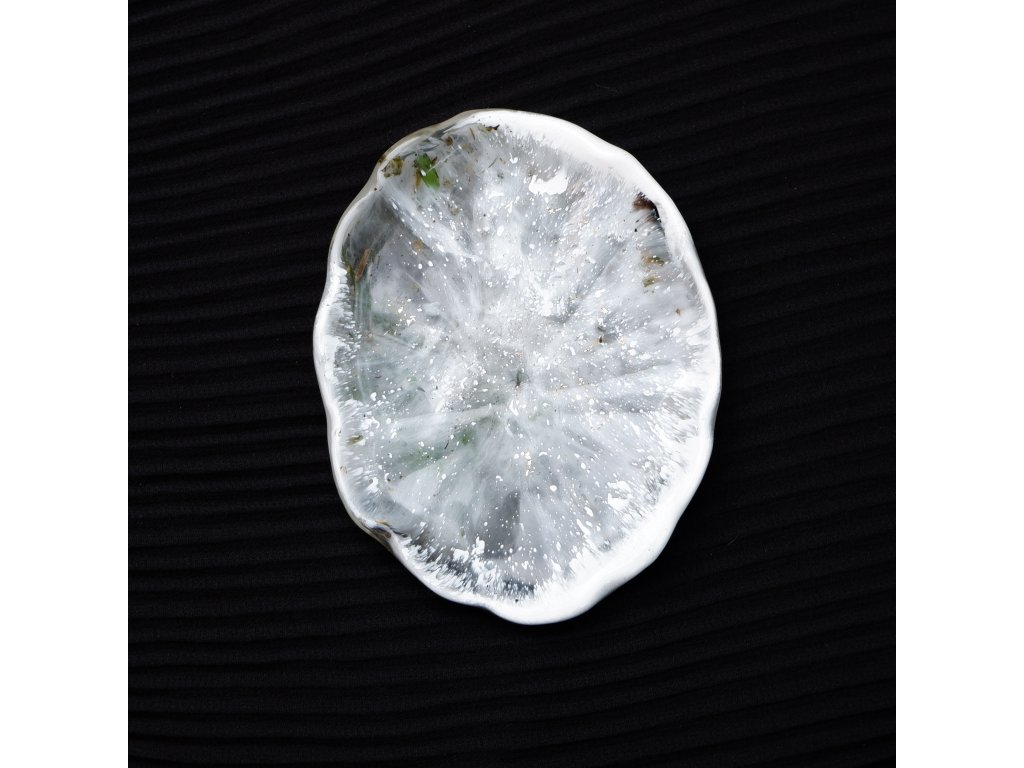 Malý servírovací tácek v bílé, nenápadně konopný.