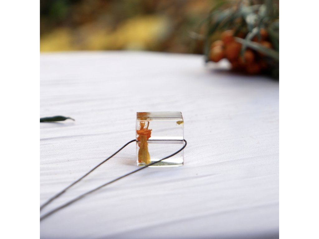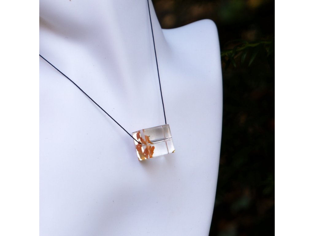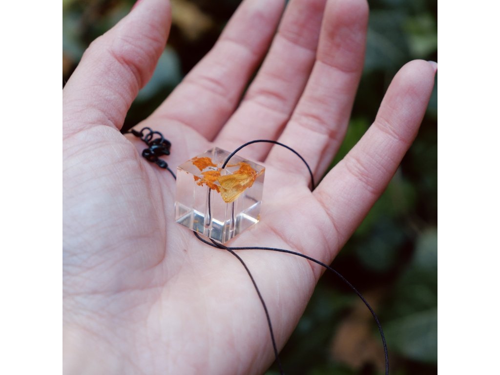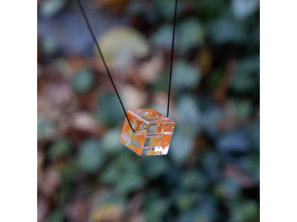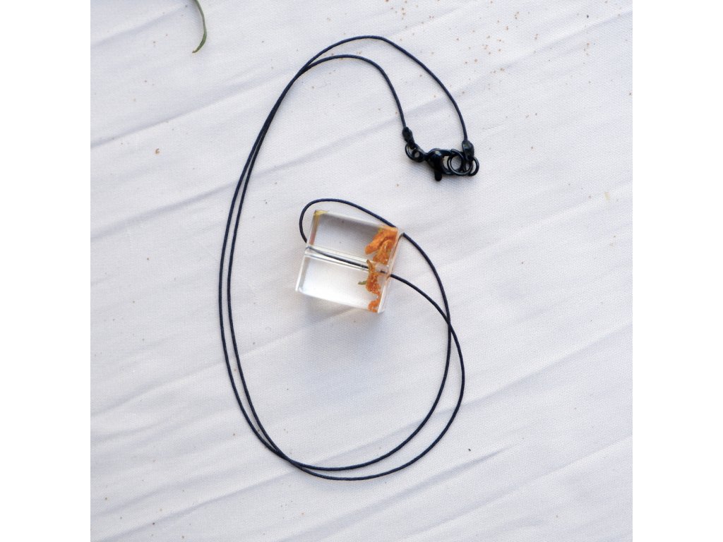 Krychlový korálek z epoxidové pryskyřice na bavlněné šňůrce s komponenty z nerezové oceli (304) s Black Ionic povrchovou úpravou.strana krychle: 1,5 cmdélka šňůrky: 44 cmpéče