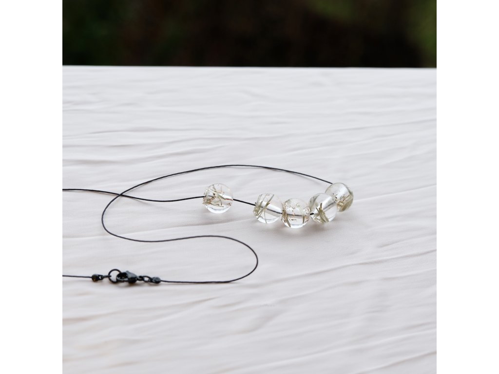 Jehličí a zlaté nitky zalité v čirých korálkách ve tvaru borůvek. Něžné, lesní, trochu slavnostní.