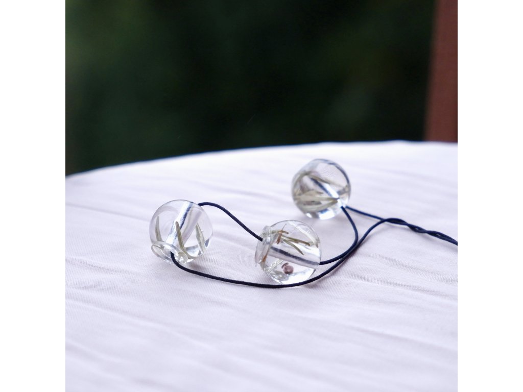 Smrkové jehličí zalité v jemných korálkách ve tvaru borůvek. Něžné lesní.