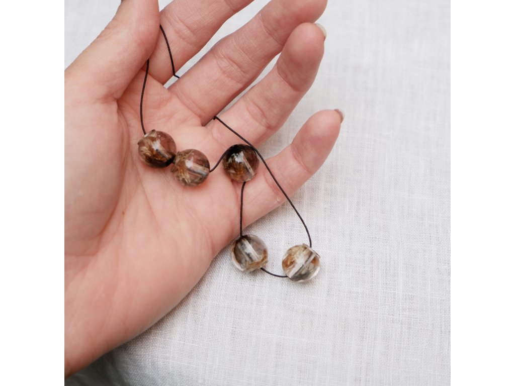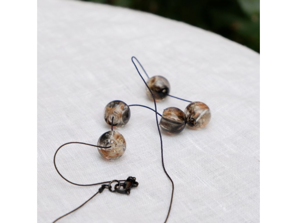Korálky ve tvaru borůvek s květy statice zalitými v kouři.