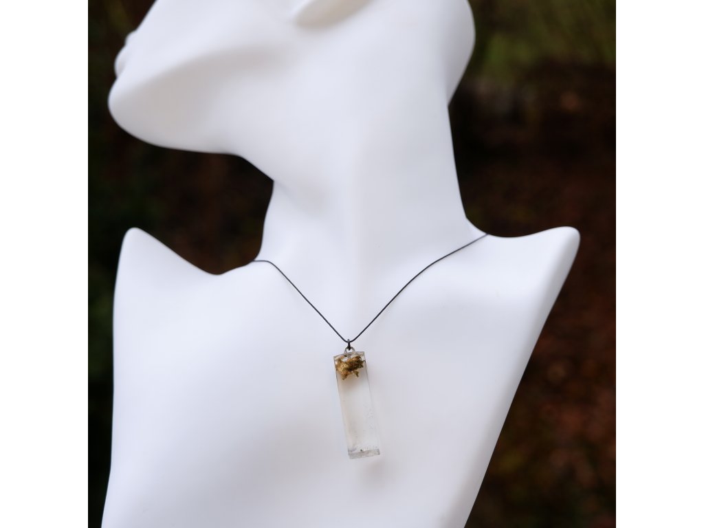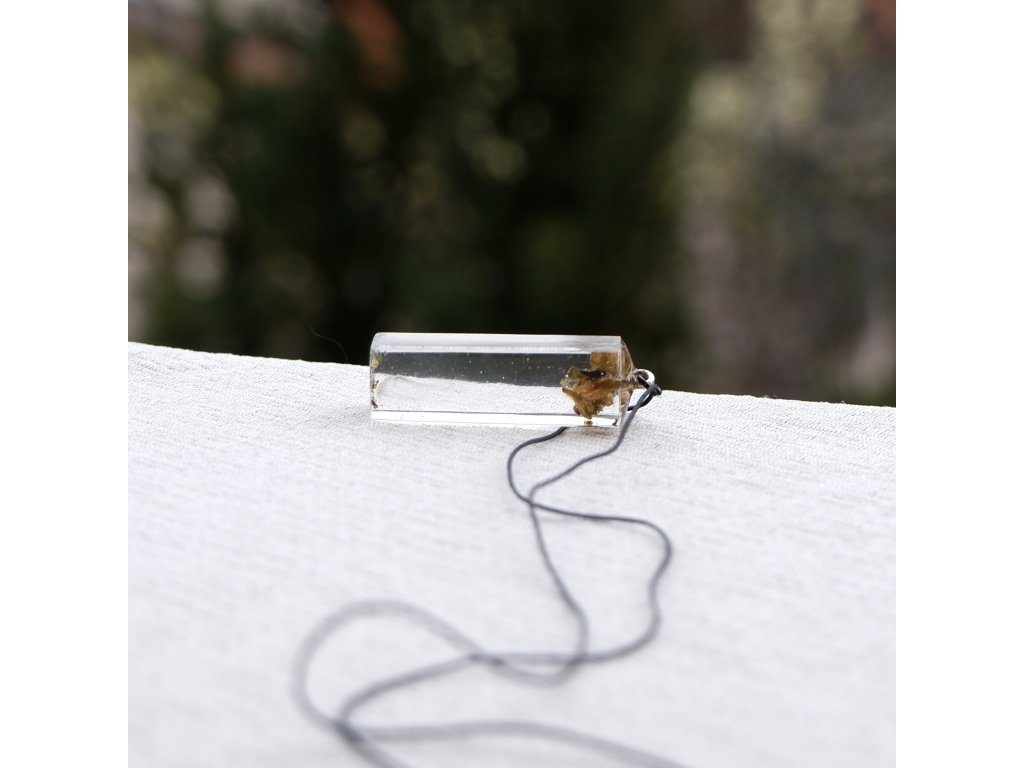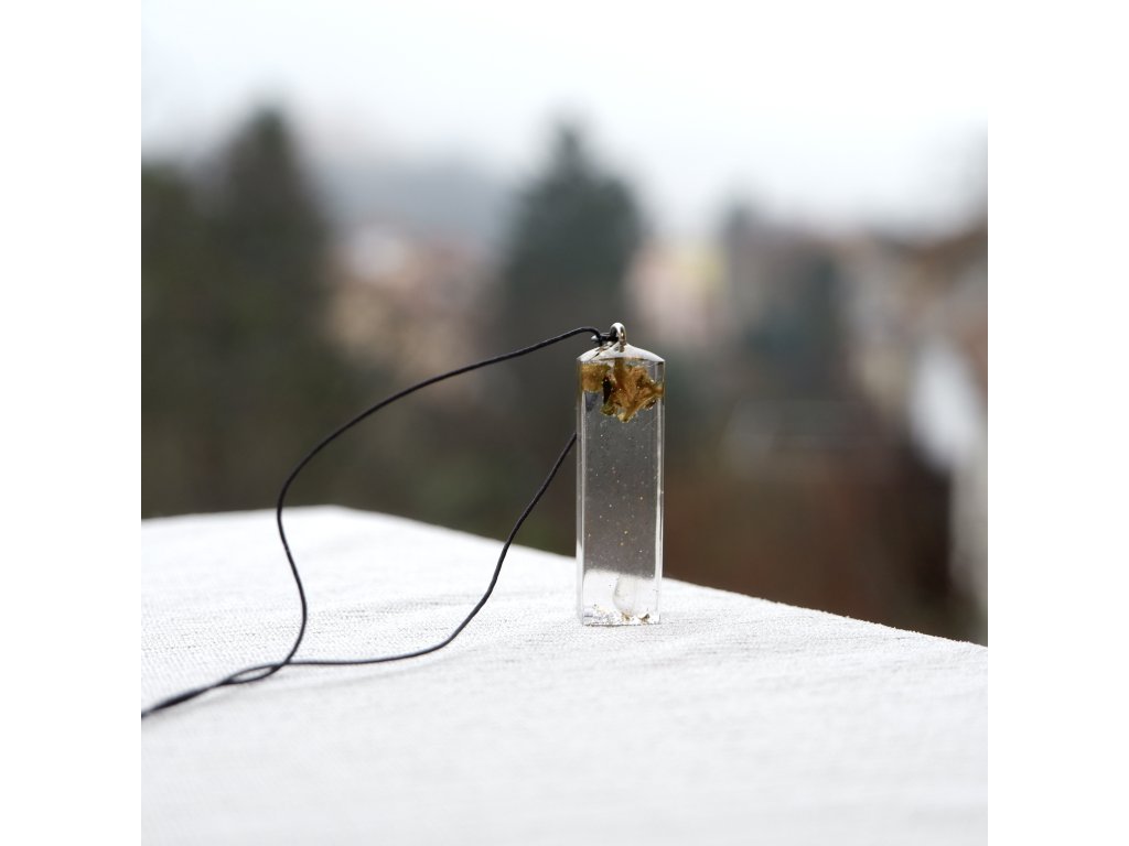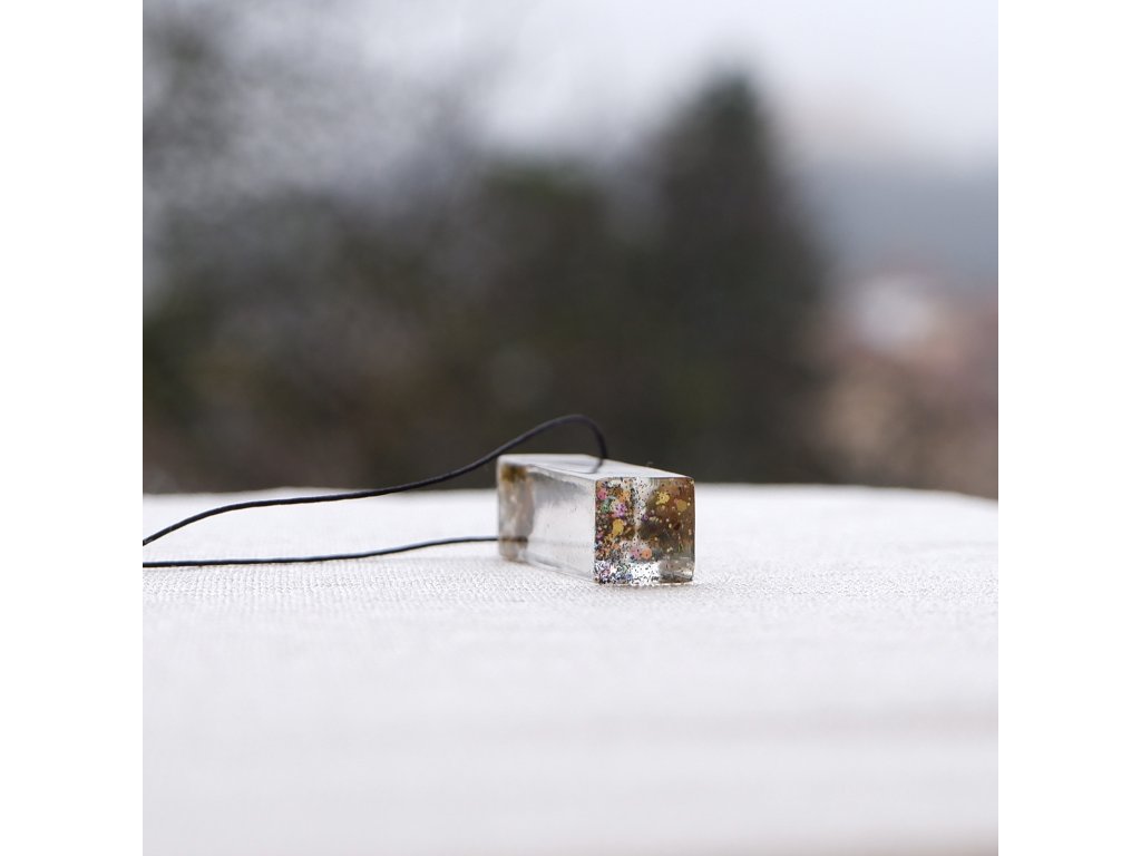 Konopí zalité v jemném čirém přívěsku s decentním barevným třpytem.