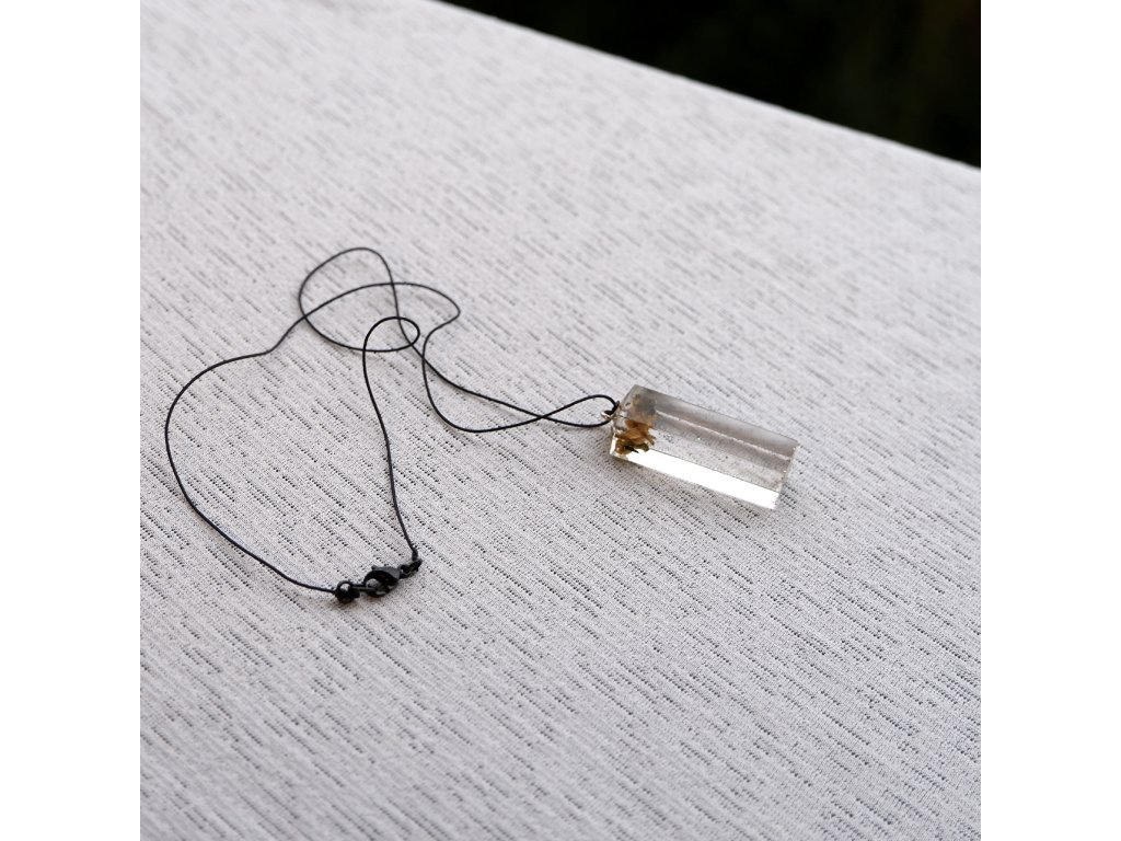 Přívěsek z epoxidové pryskyřice na bavlněné šňůrce s komponenty z nerezové oceli (304) s Black Ionic povrchovou úpravou.